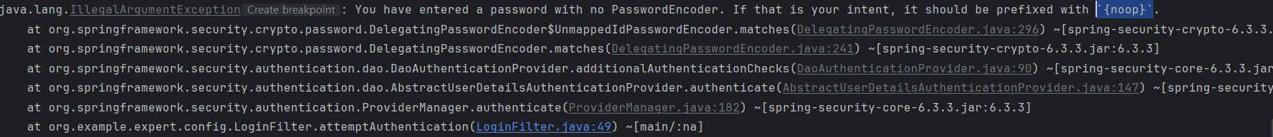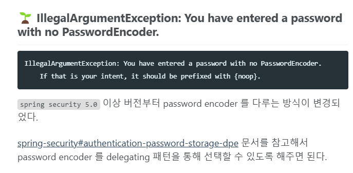 => 일단 나오는 정보에 의하면 PasswordEncoder 를 사용하지 않아서 그리고 머릿말로 {noop} 이라는 접두사가 붙어야 한다고 한다.