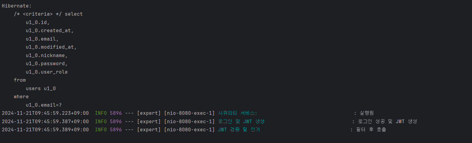 => 로그인을 해보니 헤더에 토큰과 함께 200 으로 정상적인 응답이 왔으며 아래와 같이 콘솔도 정상적으로 동작하였다. (실행 로그 정상 출력)