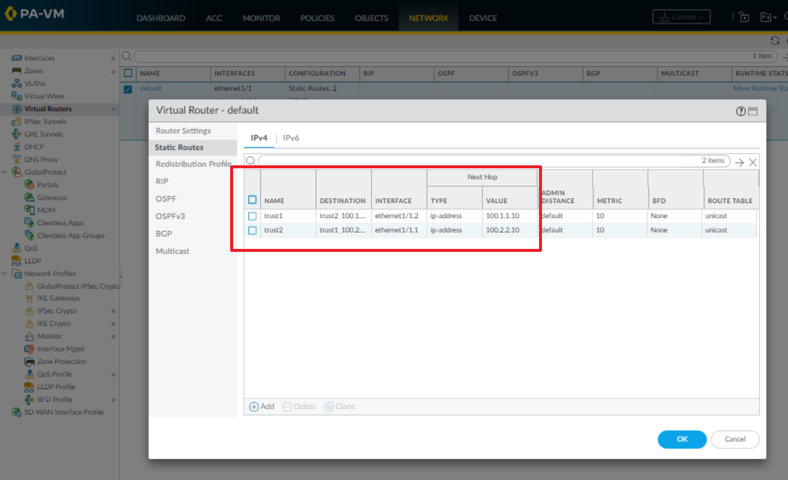 Note that I specified the Next Hop as the IP address assigned to the VLAN interfaces of the switch.