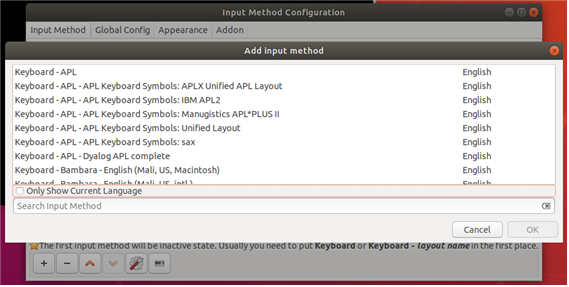 5) +를 누르고 "Only Show Current Language” 체크박스에 해제 후 ‘hangul’를 추가