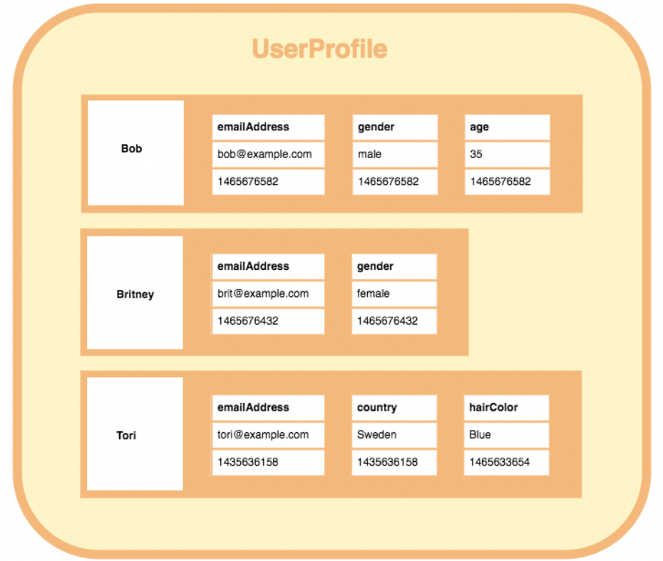 - 행마다 키와 해당 값을 저장할 때마다 각각 다른 값의 다른 수의 스키마를 가질 수 있다.