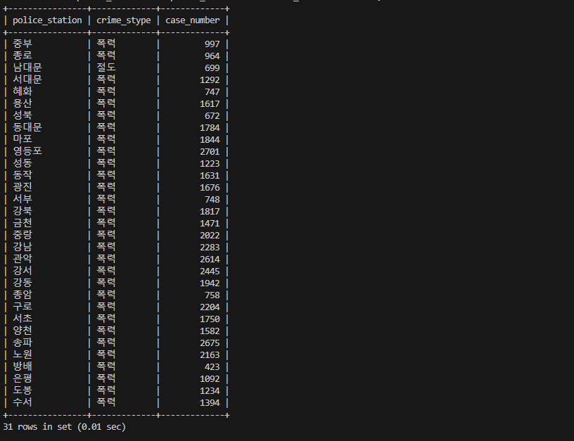 -> (select police_station, max(case_number) count from crime_status where status_type like '발생' group by police_station) m