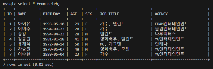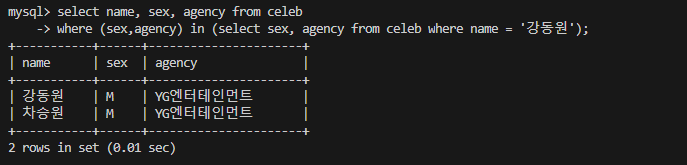-> where (sex,agency) in (select sex, agency from celeb where name = '강동원');