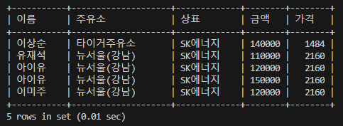 5. refueling 테이블과 oil_price 테이블에서 10만원 이상 주유한 연예인 이름, 상호, 상표, 주유 금액, 가격을 Inline View 사용하여 조회