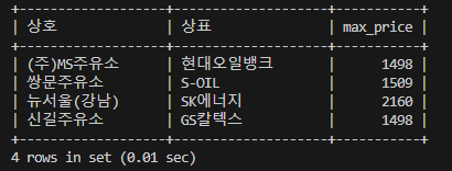 from oil_price o, (select 상표, max(가격) max_price from oil_price group by 상표) s