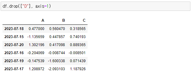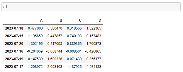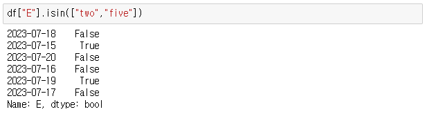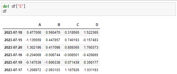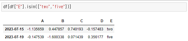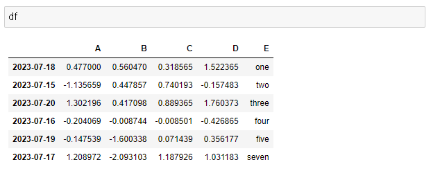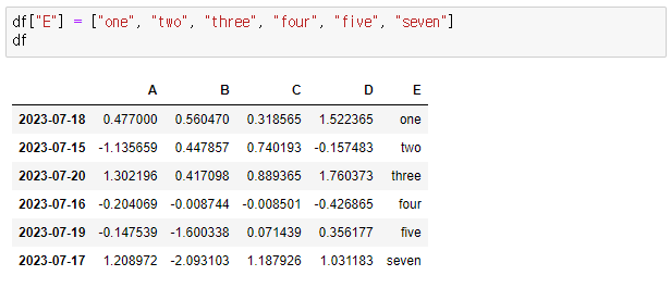 > df["E"] = ["one", "two", "three", "four", "five", "seven"]