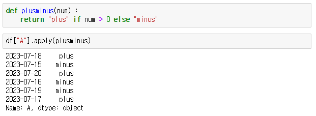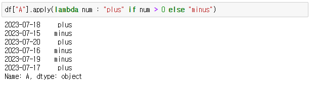 > df["A"].apply(lambda num : "plus" if num > 0 else "minus")