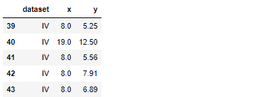 총 44개의 데이터, 그리고 x,y data는 float형, dataset은 category형 자료인 것 같음