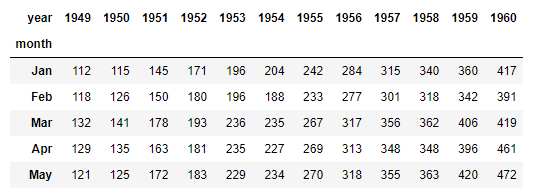 flights = flights.pivot(index="month", columns="year", values="passengers")