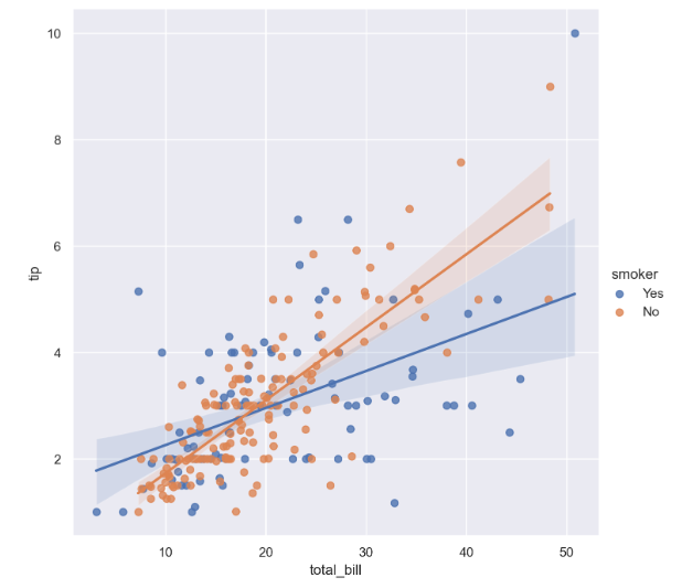 흡연자의 경우보다, 비흡연자의 경우 total_bill 과 tip 사이의 더 큰 양의 상관관계를 가진다.