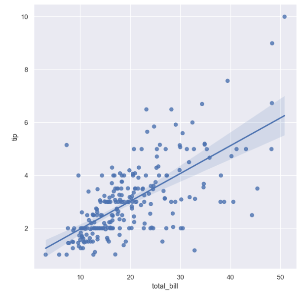 특히 total_bill 이 10 ~ 20 일 때 data들 간의 상관관계가 좀 더 강한 모습을 보인다.