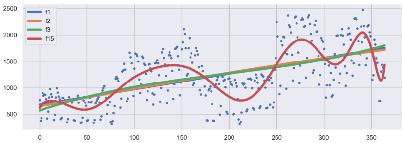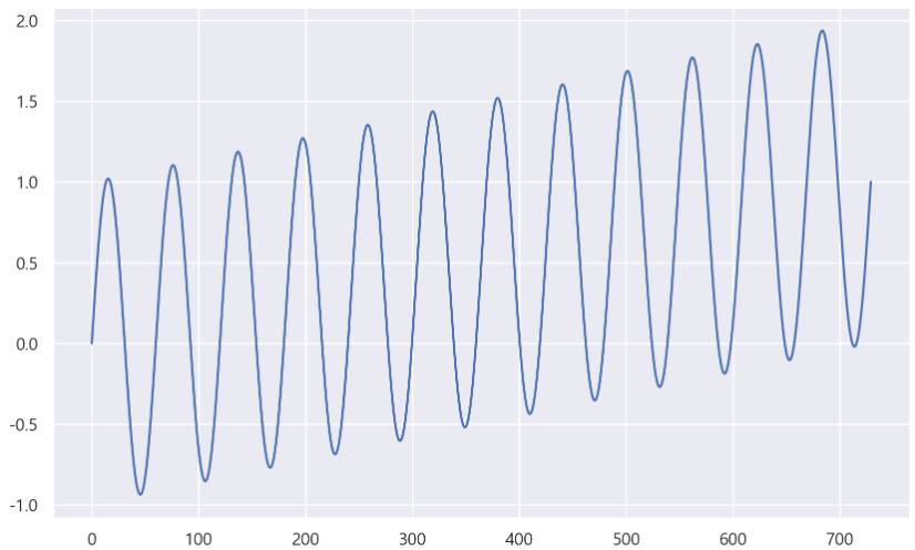 result = np.sin(2*np.pi*12*time) + time + np.random.randn(365*2)/4