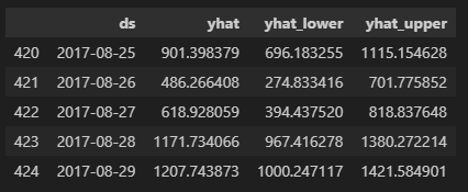 forecast[["ds", "yhat", "yhat_lower", "yhat_upper"]].tail()