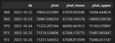 forecast[["ds", "yhat", "yhat_lower", "yhat_upper"]].tail()