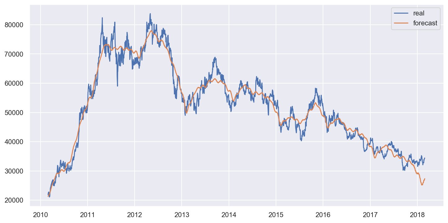 실제 데이터는 예측보다 좀 더 높은 수치를 기록함
