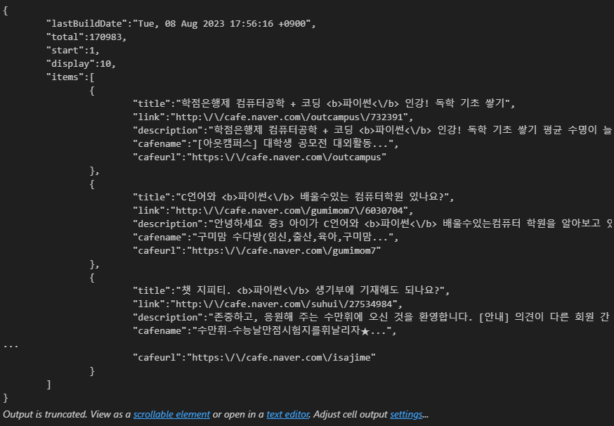 url = "https://openapi.naver.com/v1/search/cafearticle?query=" + encText