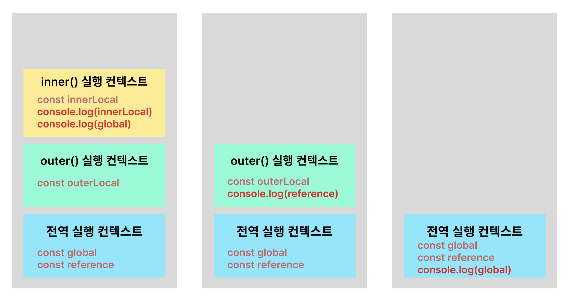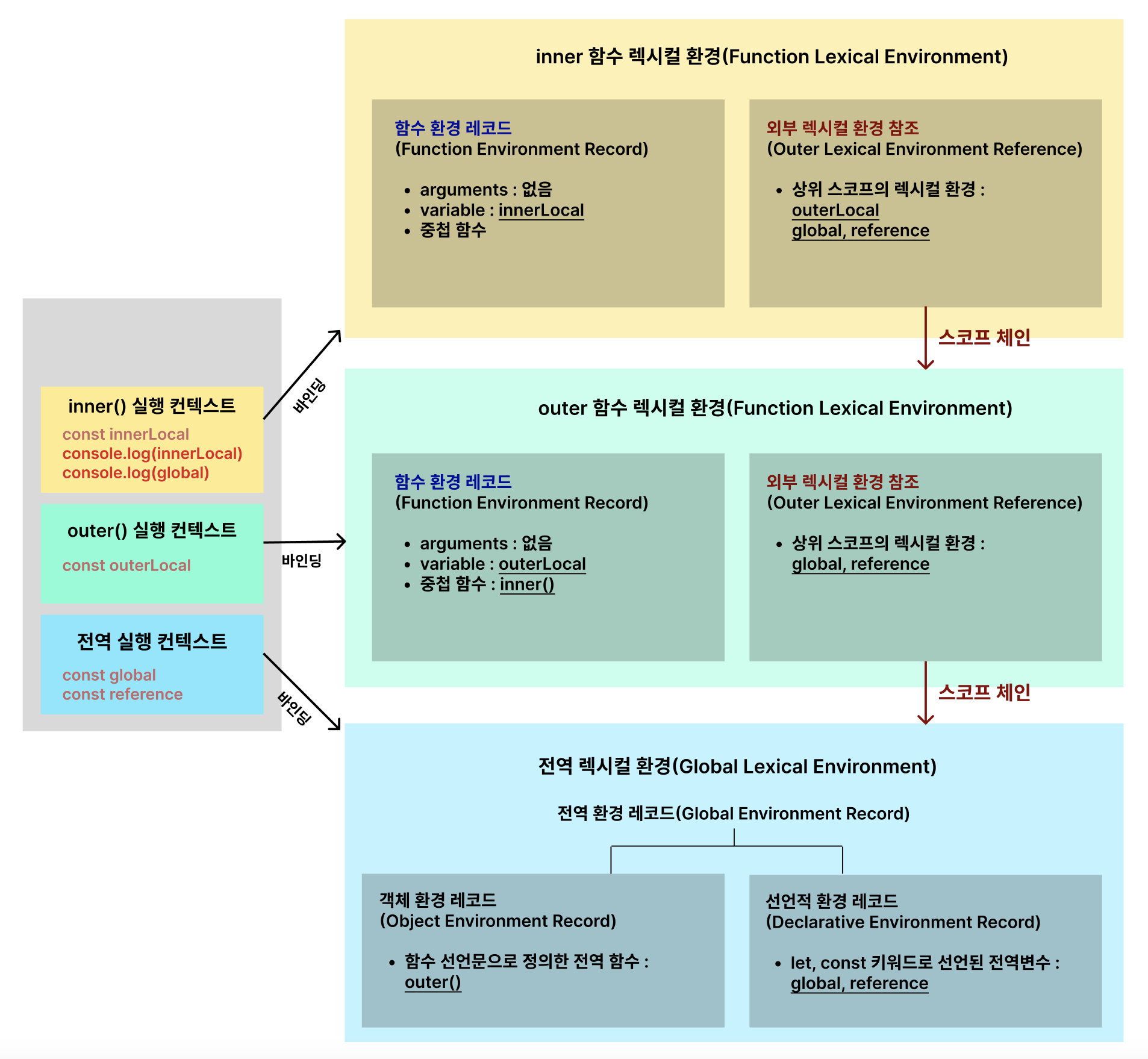 이러한 스코프 체인을 통해 inner 함수 외부 렉시컬 환경 참조에 outerLocal, global, reference 변수 모두가 담겨있을 수 있게 된다.(그림)