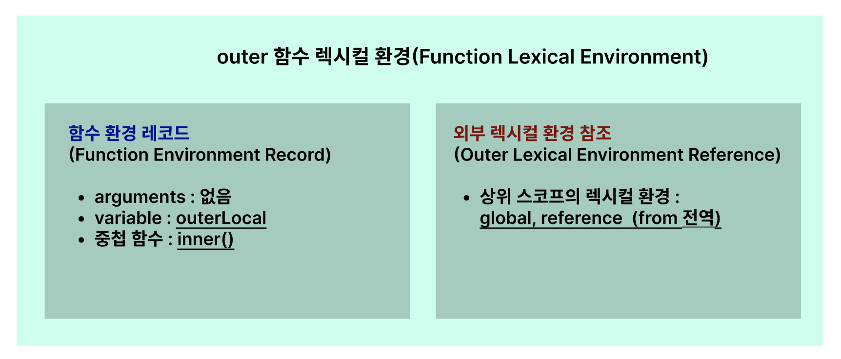 outer 함수 렉시컬 환경함수 렉시컬 환경은 함수 환경 레코드와 외부 렉시컬 환경 참조로 구성되어 있다.