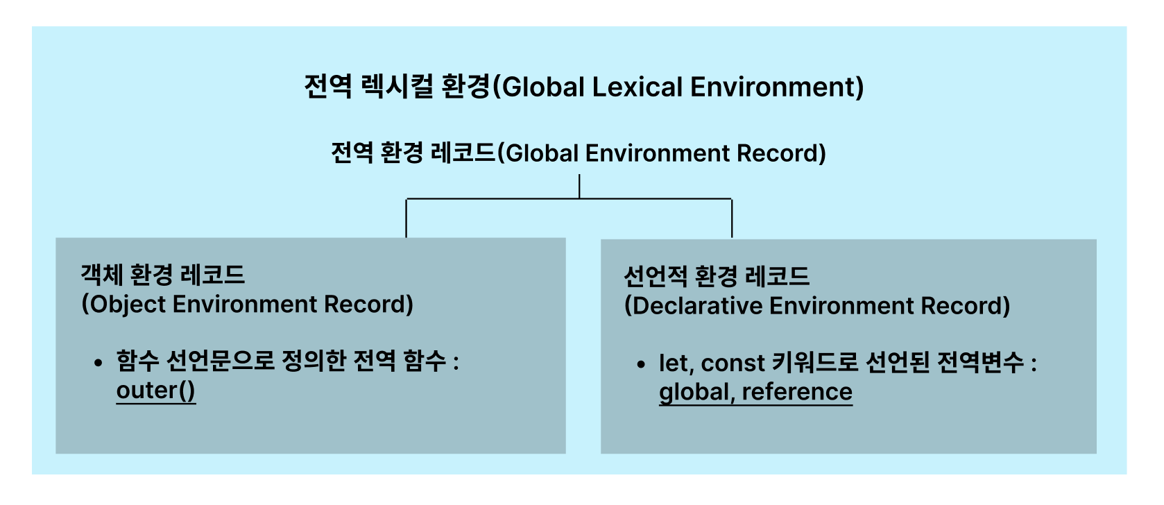 위 예시 코드가 실행되어 전역 컨텍스트가 생길 때, outer 함수는 생성단계에서 호이스팅되어 선언과 동시에 함수 생성까지 완료된다. 그리고 전역 렉시컬 환경의 객체 환경 레코드에 { outer : Function } 형태로 저장된다. (그림 참고)