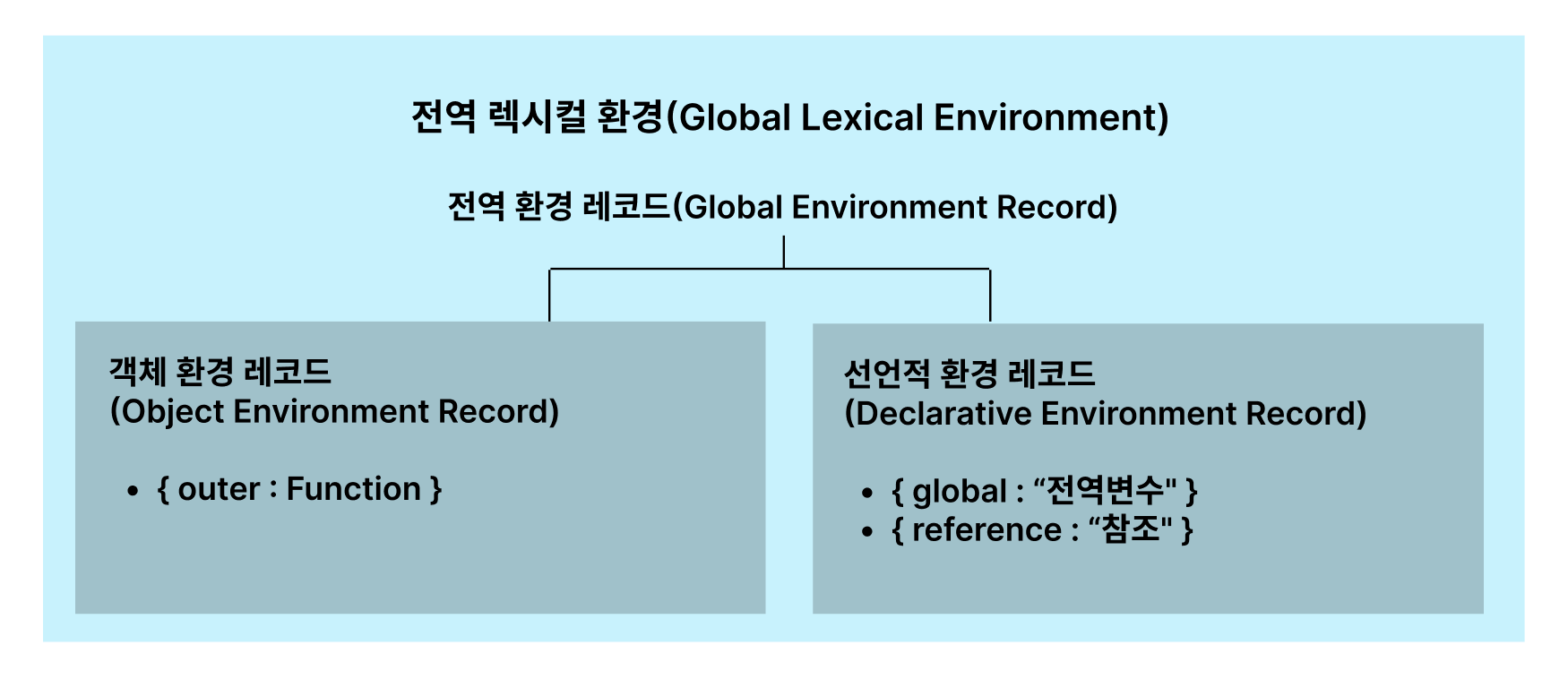 전역 렉시컬 환경의 전역 환경 레코드는 객체 환경 레코드와 선언적 환경 레코드로 구성되어 있다.