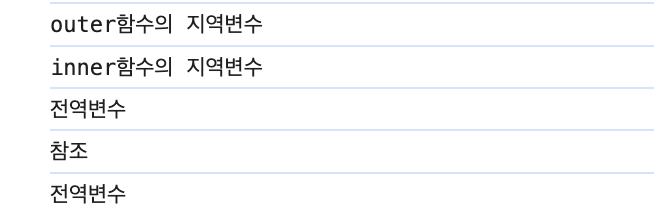 innerLocal 이라는 변수가 있으며, 이 변수에는 "inner함수의 지역변수" 라는 값이 바인딩되어있다.외부 렉시컬 환경 참조