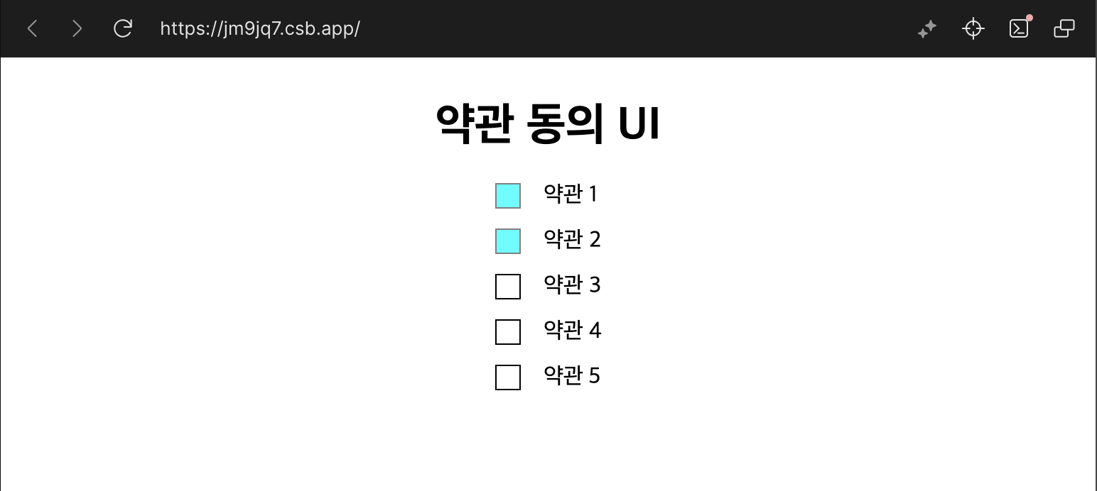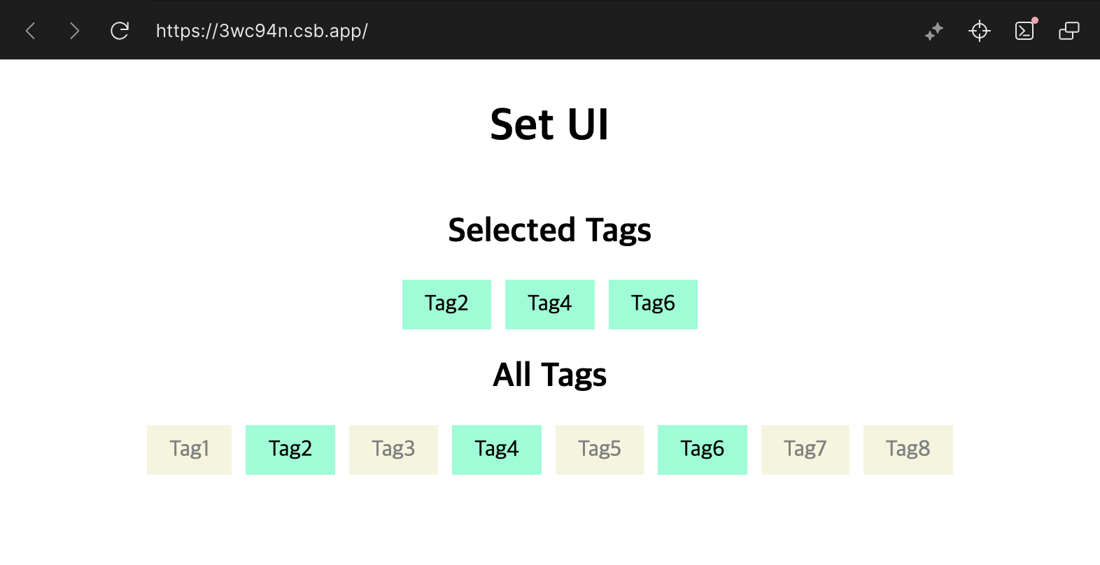 selectedTerms 라는 상태값은 Set 객체 형태로 되어있다.handleOnClick이 실행된다. 새로운 newTerms 라는 복제 Set을 하나 만든다.selectedTerms에 파라미터로 넘어온 id 값이 있다면 삭제하고, 없다면 추가한다. 그리고 newTerms 로 상태값을 업데이트한다.selectedTerms 를 JSX 에 map 메소드를 이용해 나열한다.
