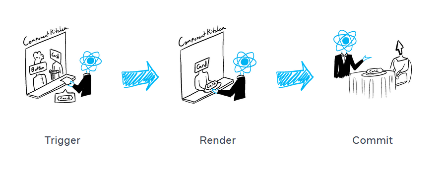 - Triggering a render (delivering the guest’s order to the kitchen) 리액트가 렌더를 일으킨다.