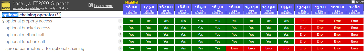 Node 버전에 따라 ES 문법 지원 범위가 달라진다. 위 이미지를 보면, ES2020 문법인 Optional chaining operator(?.)는 Node 12 버전에서는 동작하지 않는다. 최신 문법 사용하는데 Node 버전 종속성을 회피하고 싶어 Babel을 사용했다.