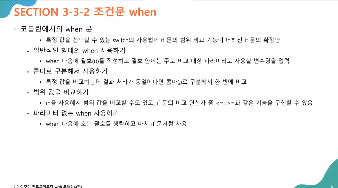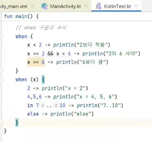 포인트: when 문의 사용법이 자바와 다르므로 코틀린에서 사용법을 익혀야함