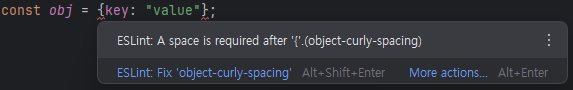 eslint.config.js에 테스트용 룰 추가object-curly-spacing rule은 중괄호 {} 내부에 공백을 강제하거나 금지한다.{key: "value"}{ key: "value" }rules: {