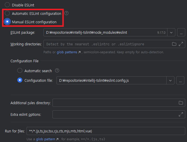 Disable ESLint가 선택되어 있다면 Automatic ESLint configuration이나 Manual ESLint configuration을 선택한다.automatic도 문제 없어서 automatic을 선택했지만, 세부적인 configuration이 필요한 경우 manual을 선택하면 될 것 같다.