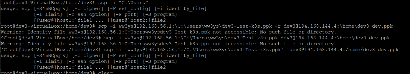 ^Croot@dev3-VirtualBox:/home/dev3# scp -i 'ww3ys@192.168.56.1:/C:\Users\ww3ys\dev3-Test-k8s.ppk' 'dev3@194.168.144.4:/home/dev3 dev.ppk'
