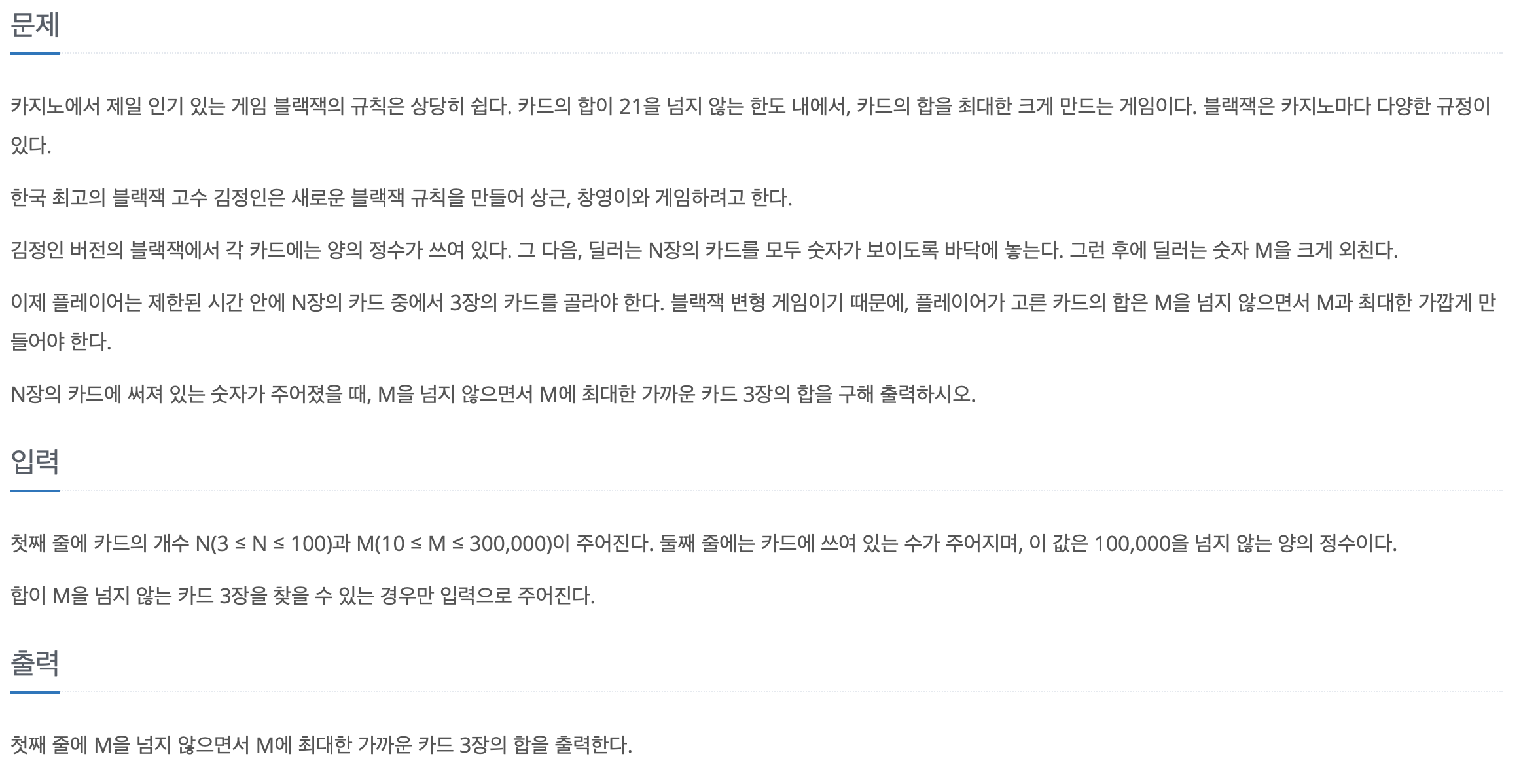 첫 줄에 입력 받은 N개의 카드 중에 3개를 뽑아 M보다 크지 않은