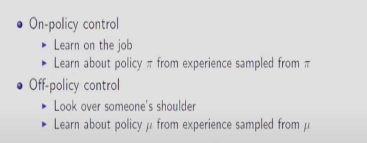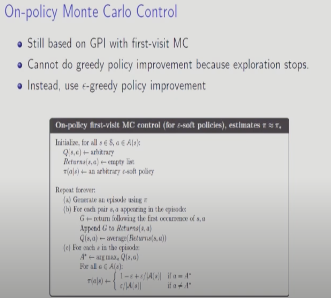 이전에 배운 TD에서는 t+1 타임의 S까지만 알면됐었다.(V를 구하면 됐으므로)하지만, SARSA는 Q-Function을 구해야하므로 Action을 구해야 한다. 즉, TD에서 V를 Q로 바꾼게 SARSA이다. Optimal Policy를 구하고 Exploration도 해야하는데 하나의 Policy로만 학습시키는 방법은 앱실론 그리디가 가장 효율적이다.