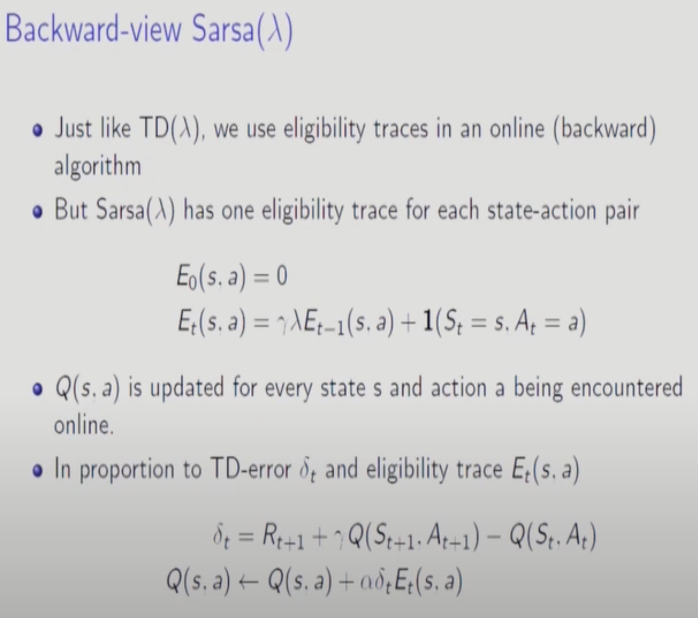 Eligiblity Trace를 사용하여 Backward-View로 바꾼다. E는 앞에서 다뤘듯이 최근에 발생하거나 많이 발생한 S,A Pair에 높은 가중치를 부여한다.