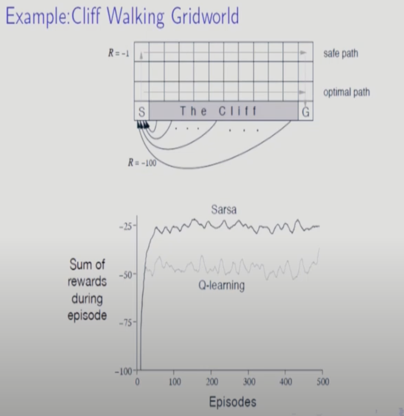 이런 예제와 같이 극심한(?) state가 있을경우 안전한 SARSA를 쓰는게 낫다.