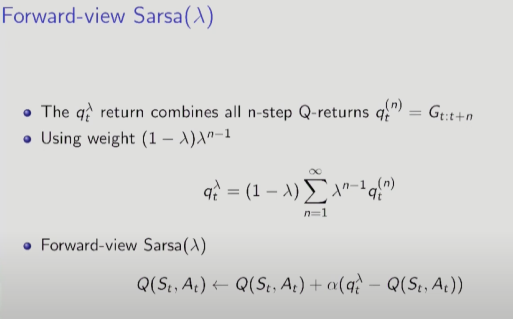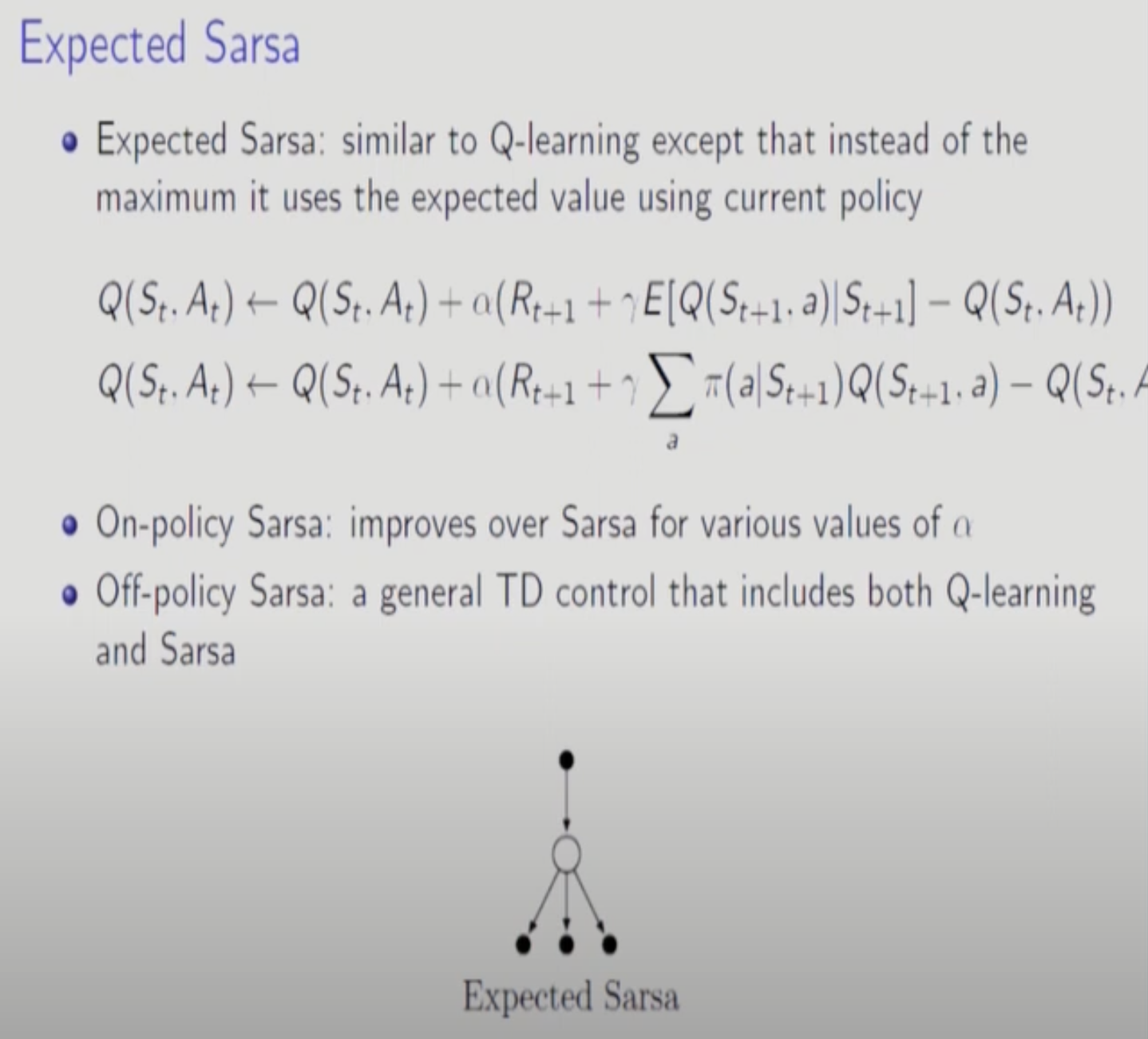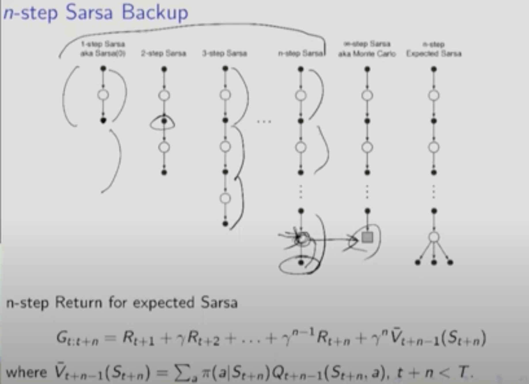 => 마지막 state에 대해서는 모든 action의 평균을 취한다. 이것을 V바로 표현한다. 마지막 state의 모든 action을 고려하므로 N-Step TD보다 정확성이 높아진다. 마지막 State 전까지 만들어진 Model을 가지고 가능한 Q-Function의 평균을 취하는 것.