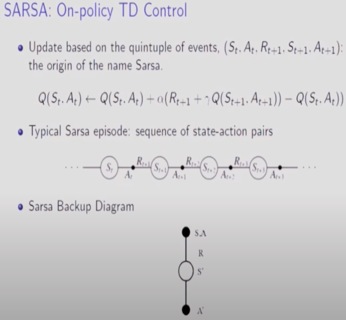 Prediction문제에서 TD를 다루던 방법론이 Control 가면 SARSA가 되는 것이다. TD를 좁은 의미로 사용하면 V를 구하는 Approach이다. 넓은 의미로 사용하면 미래에 대한 Prediction과 현재값과의 차이를 통해 V또는 Q를 구하는 일반적인 방법론을 칭한다. 따라서 SARSA도 넓은 의미로는 TD에 속한다 할 수 있다.