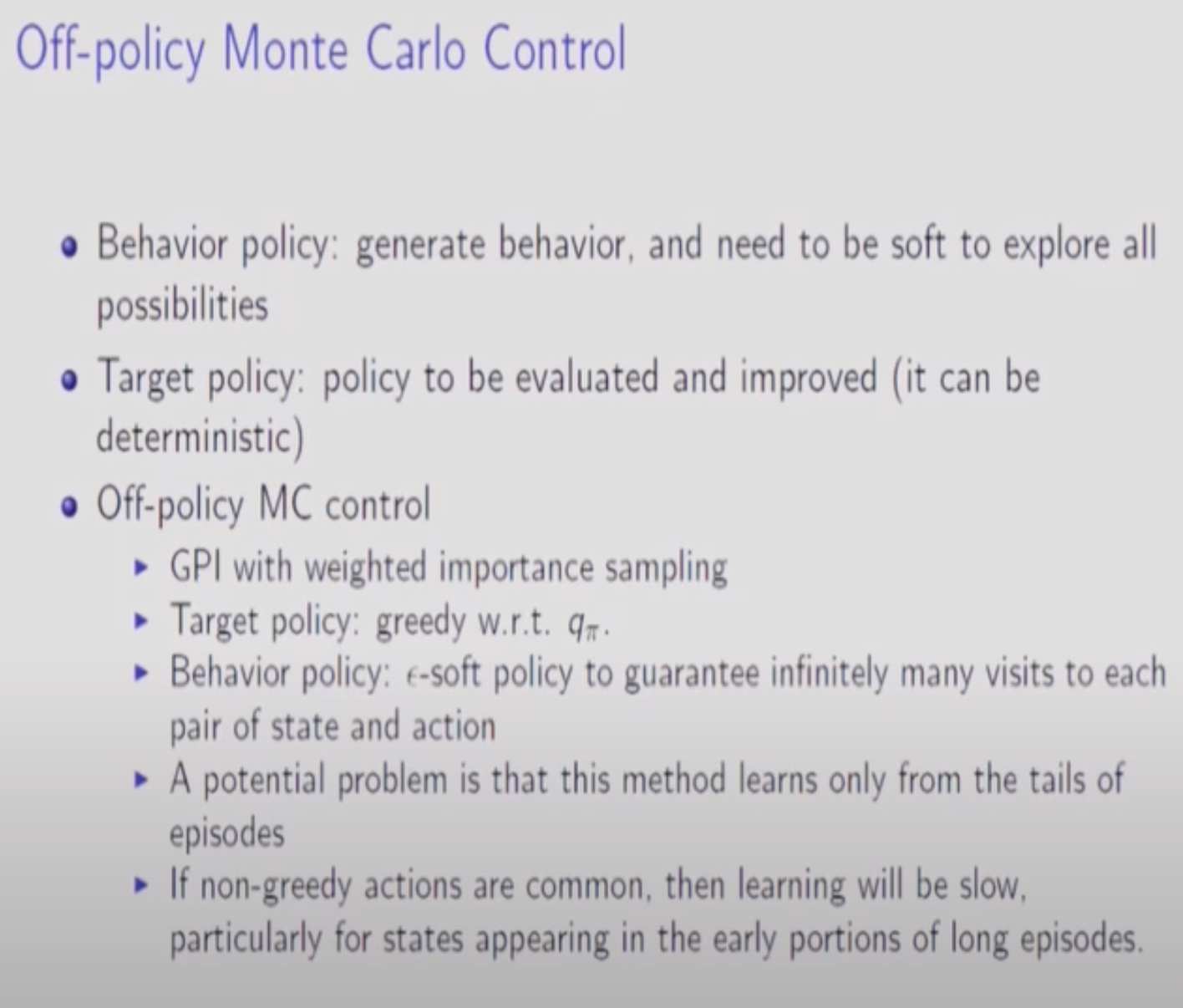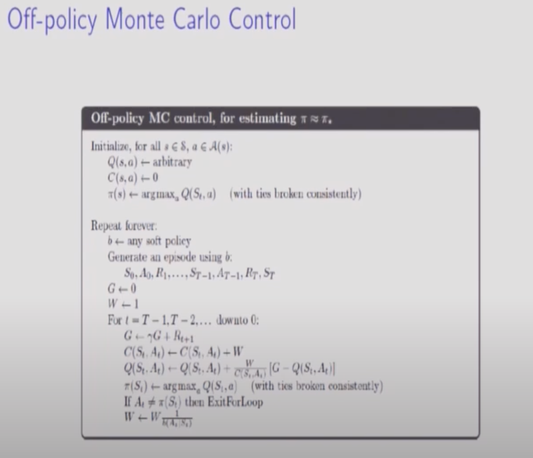 Off-Policy에 대한 설명이다. 에피소드안에 확률이 앱실론이되는 Greedy하지 않은 action(Target에서 벗어나는 action)이 골라지면 해당 에피소드를 다 버려야 한다.(업데이트가 이루어지지 않으므로).