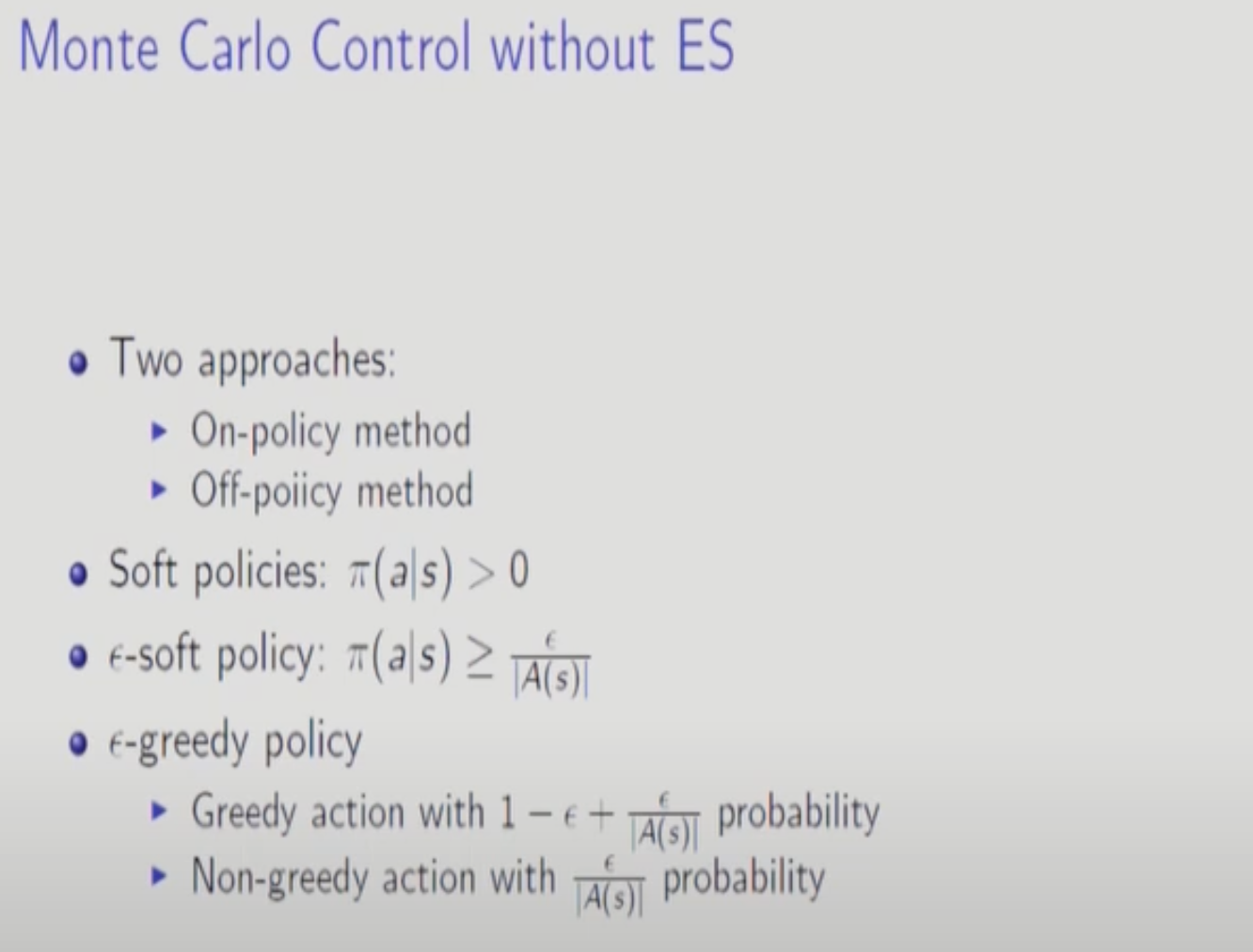 가장 Q function을 최대화 시키는 Action에 1-앱실론의 확률로 확률을 다 몰아주고 나머지 action들이 앱실론의 확률을 나눠갖는 방법. 여기에 최소확률 앱실론/A(s)를 더해준다.
