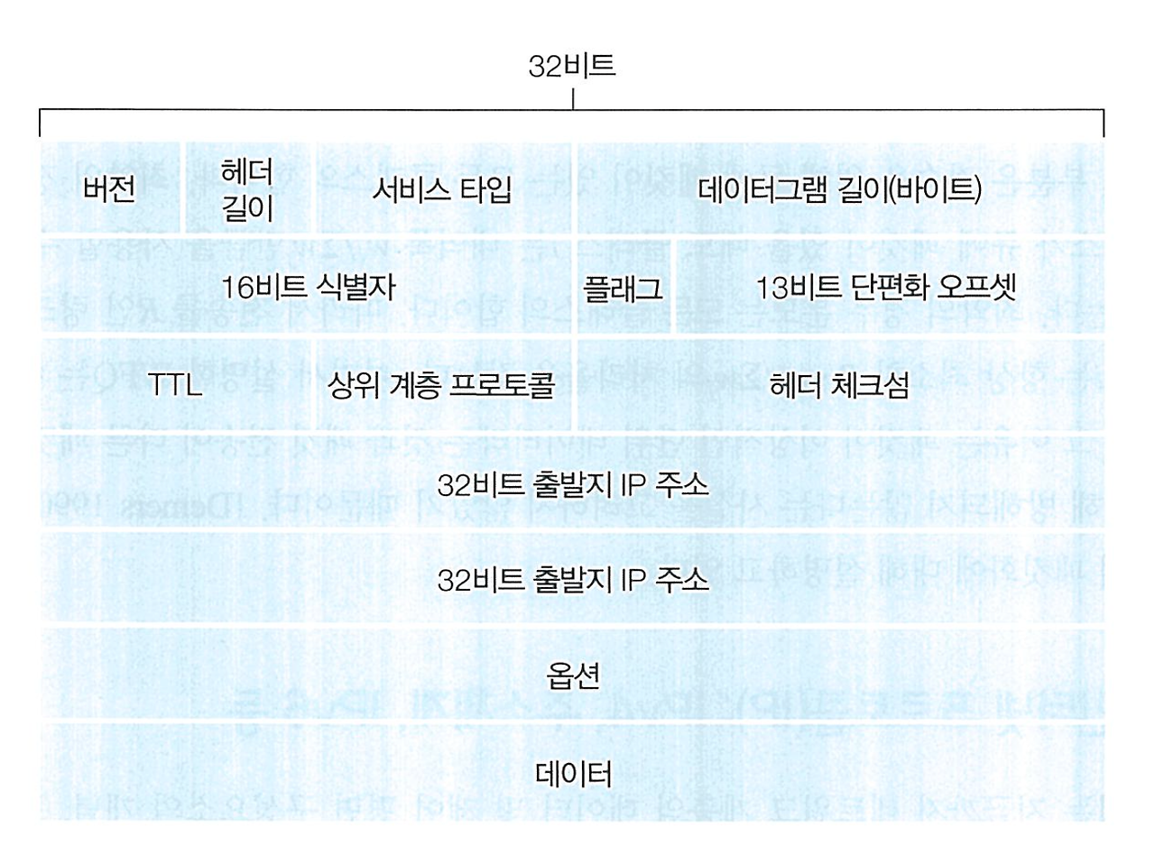 TTL (Time-to-Live) : 네트워크에서 데이터그램이 무한히 순화하지 않도록 한다. 라우터가 데이터그램을 처리할 때마다 감소