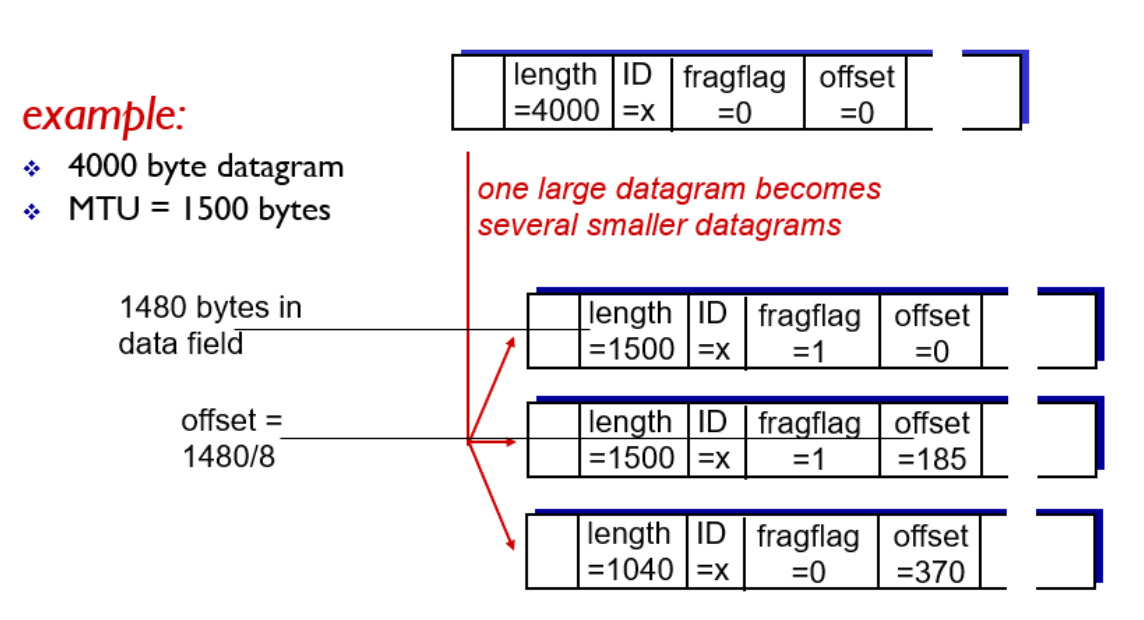 출력 링크가 IP 데이터그램의 길이보다 작은 MTU를 갖게되는 상황을 해결하기 위해 단편(fragment)으로 데이터그램을 분할한다.