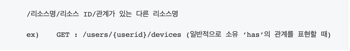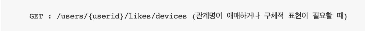 만약에 관계명이 복잡하다면 이를 서브 리소스에 명시적으로 표현하는 방법이 있습니다. 예를 들어 사용자가 좋아하는 디바이스 목록을 표현해야 할 경우 다음과 같은 형태로 사용할 수 있습니다.