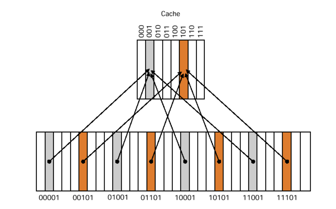 위의 그림과 같이 하위 계층 N개 주소가 캐쉬의 1개 주소에 매핑되어 데이터를 배치하는 방식이다.