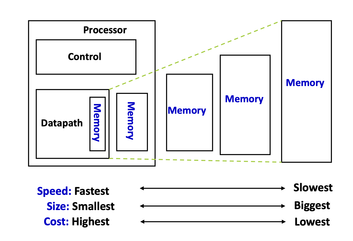 모든 메모리를 가장 빠른 SRAM으로 구성하면 좋겠지만, 비용 때문에 현실적으로 어렵기 때문에 보다 경제적이고 합리적인 해결책으로써 계층 구조 형태의 메모리 설계 방식이 제안되었다.