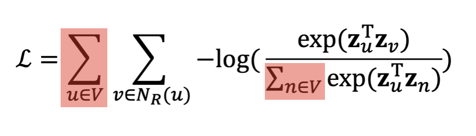 위의 식을 종합해보면 아래의 목적 함수를 얻을 수 있는데 전체 노드 간의 유사도와 확률을 구하기 위해서(수식의 빨간색 부분), 목적 함수의 시간복잡도가 되고 Node의 개수가 많아질수록 비효율적이라는 문제가 있다.