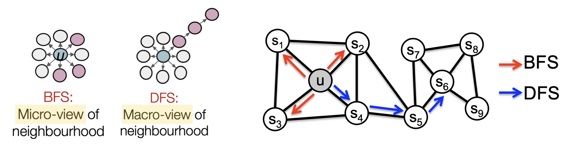 Node2Vec은 아래 그림의 BFS를 활용하여 그래프의 Local(Micro-View) Network를, DFS를 활용해서 Global(Macro-View) Network를 탐색하는 방식이며 이를 통해 기존 이웃 노드가 가지는 의미를 확장시키고 있다.