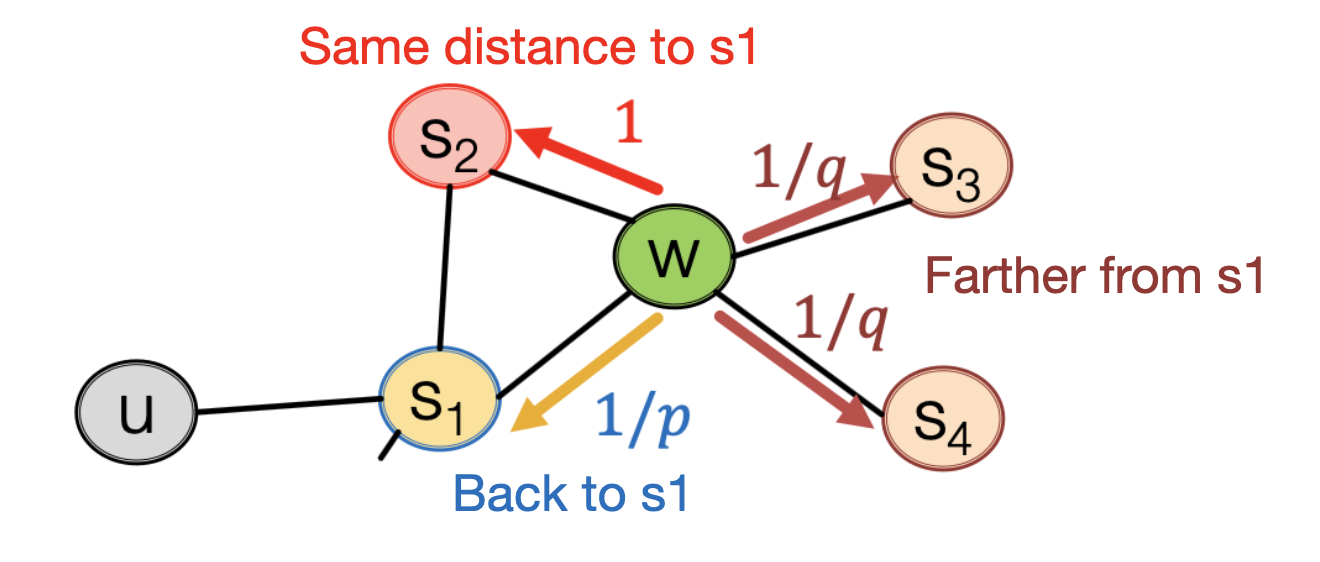 아래 그림과 같이 이전 노드가 이고 현재 노드가 일 때, 다음 이동할 노드를 선택하기 위해 를 활용한다. 이동 가능한 모든 노드에 대해 가중치를 매긴 뒤에 이동할 노드를 선택하는 방식이며, 이 때 현재 노드와 이전 노드 모두 알고 있어야 하는 Biased 2nd-order random walks 방식이라고 할 수 있다.