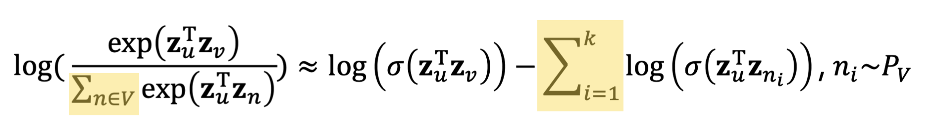 Negative Sampling 에서는 모든 Node가 아닌 개의 Negative samples(Node 와 이웃하지 않는 Node)만을 사용해서 Softmax 함숫값을 근사한다.