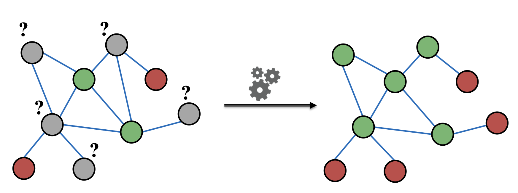 아래의 그림은 Graph 구조에서의 Node Classification의 한가지 사례로, Network(Graph)에서 일부는 Labeled Node이지만 Unlabeled Node인 다른 일부에 대해서 Node Classification (Semi-Supervised Learning)을 수행하는 경우이다.